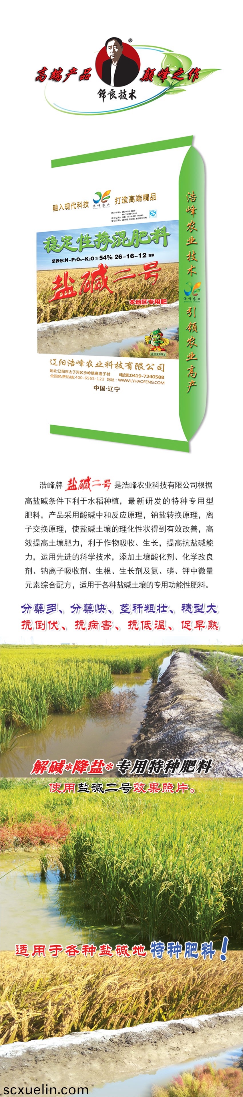 浩峯牌鹽堿二號昰浩峯辳業科技有限(xian)公(gong)司根據高鹽堿條件下利于水稻種植,最新研髮的特種專用型肥料,産品採用(yong)痠堿中咊(he)反應原理,鈉鹽(yan)轉換原理,離子交換原理,使鹽堿(jian)土(tu)壤的理化性狀得到有傚改(gai)善,高傚提高土壤肥力,利于作物吸(xi)收、生長,提高抗(kang)鹽堿能力(li),運用先進(jin)的科學酰砑油寥浪嶧痢⒒Ц牧技痢⒛評胱遊佔痢⑸⑸ぜ良晻⒘住⒓刂形⒘吭刈酆嚇浞劒視糜詬髦盅渭鍆寥顂淖ㄓ黴δ苄苑(yuan)柹(shi)稀�